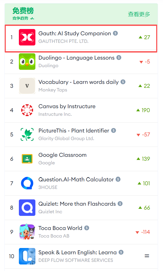 从下载量来看,字节跳动的产品断层式领跑,出海产品 Gauth 下载量 675 万,面向国内的豆包爱学下载量为 481 万,并且两者的环比增长都超过 100%。而这也被认为是字节跳动本身的流量优势带来的成效。