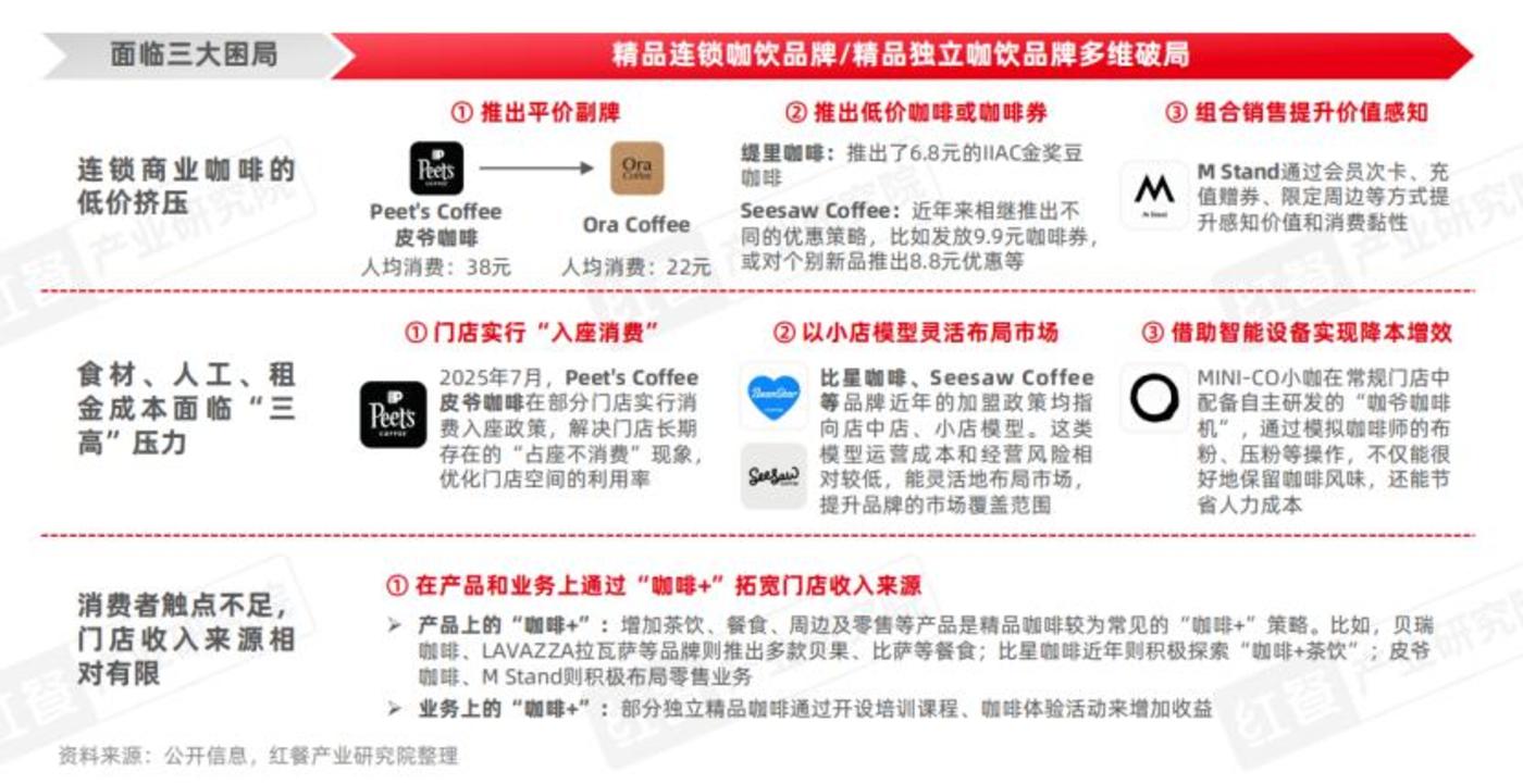 为应对这些挑战,不少精品咖饮品牌积极寻求破局之道。比如,通过推出平价副牌、低价咖啡券等方式提高性价比;或以小店模型、智能设备等手段降本增效;亦或通过 「咖啡+」 的模式实现多元业态延伸及拓宽消费场景。整体来看,精品咖啡正从高端化走向多元化、轻量化与场景化的进化阶段。