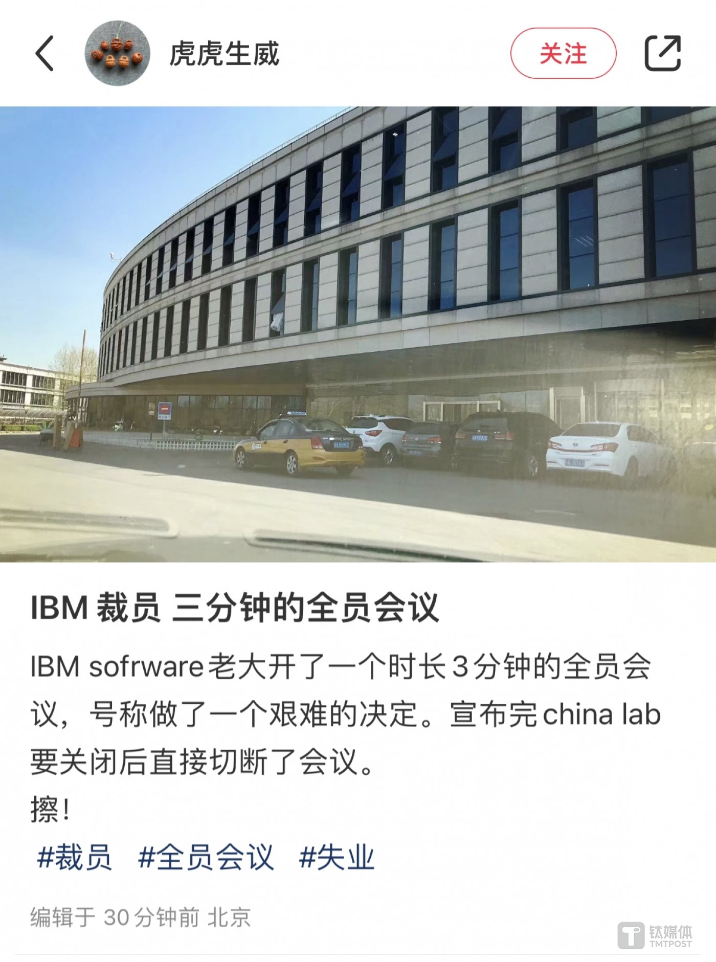 据小红书上博主发出的信息显示:「IBM sofrware 老大开了一个时长 3 分钟的全员会议,号称做了一个艰难的决定。宣布完 china lab 要关闭后直接切断了会议。」