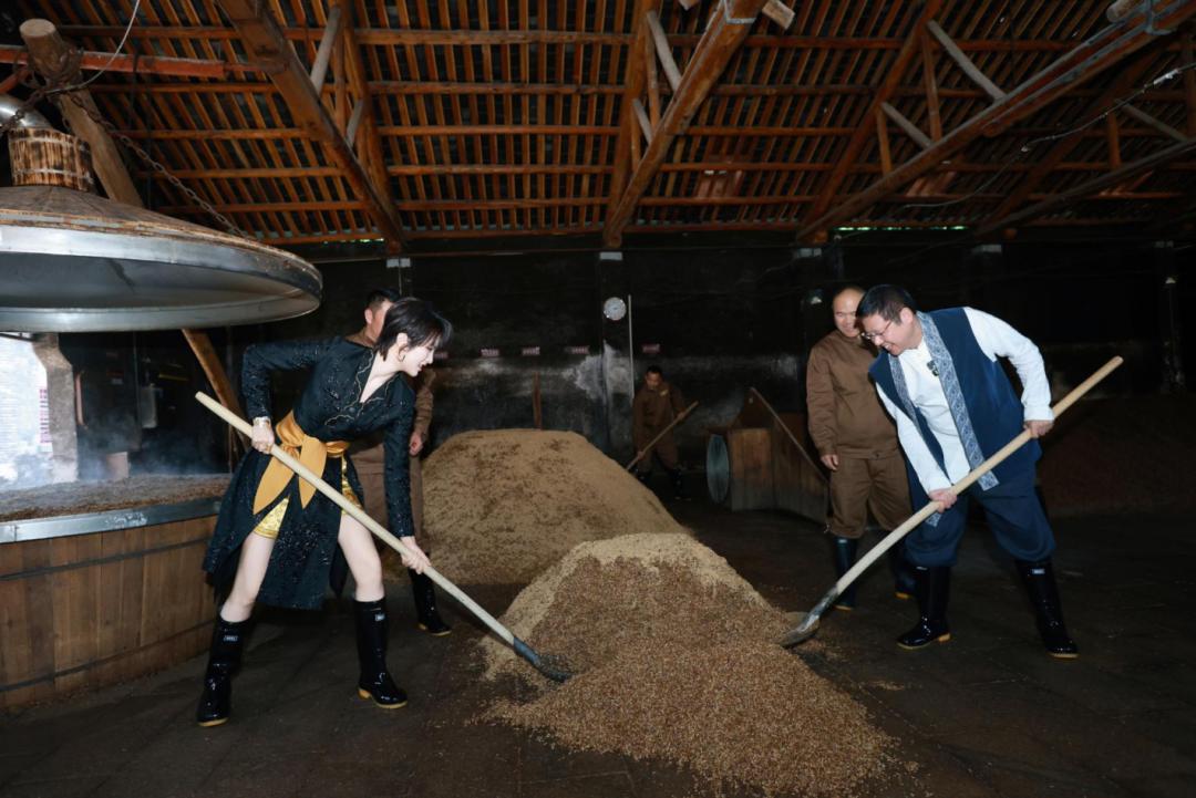 当姚安娜身着现代装束走入氤氲着酒香的古法车间,并亲自体验“ 拌料” 三道工序两人对翻、低翻快拌、拌均拌匀,她本身便成了一个流动的叙事场域—— 传统与现代在此刻交织,厚重的历史与鲜活的生命力碰撞出奇妙的文化张力。