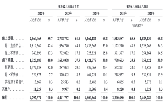 自然堂的线上、线下渠道的占比目前为 70% 和 30%,较为均衡,但直营体系的建设却稍显落后,2022-2024 年线上自营的占比从 42.4% 升至 53%,2025 年上半年为 54.3%。