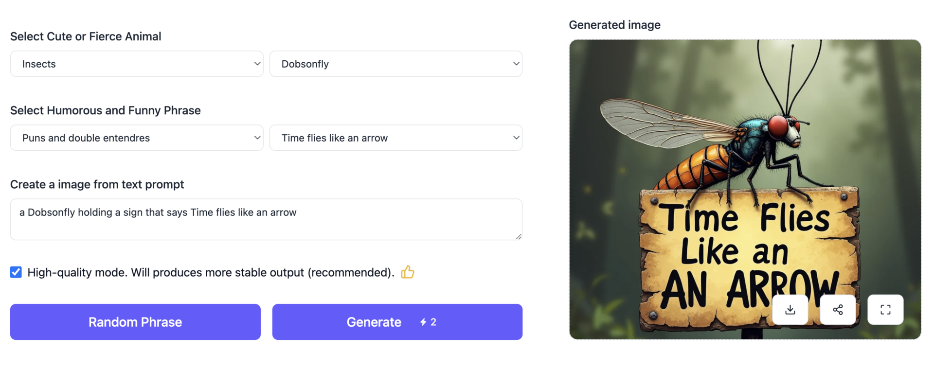 先选择一种动物,再选择一句话,然后可以生成动物拿着一块牌子写着这句话。