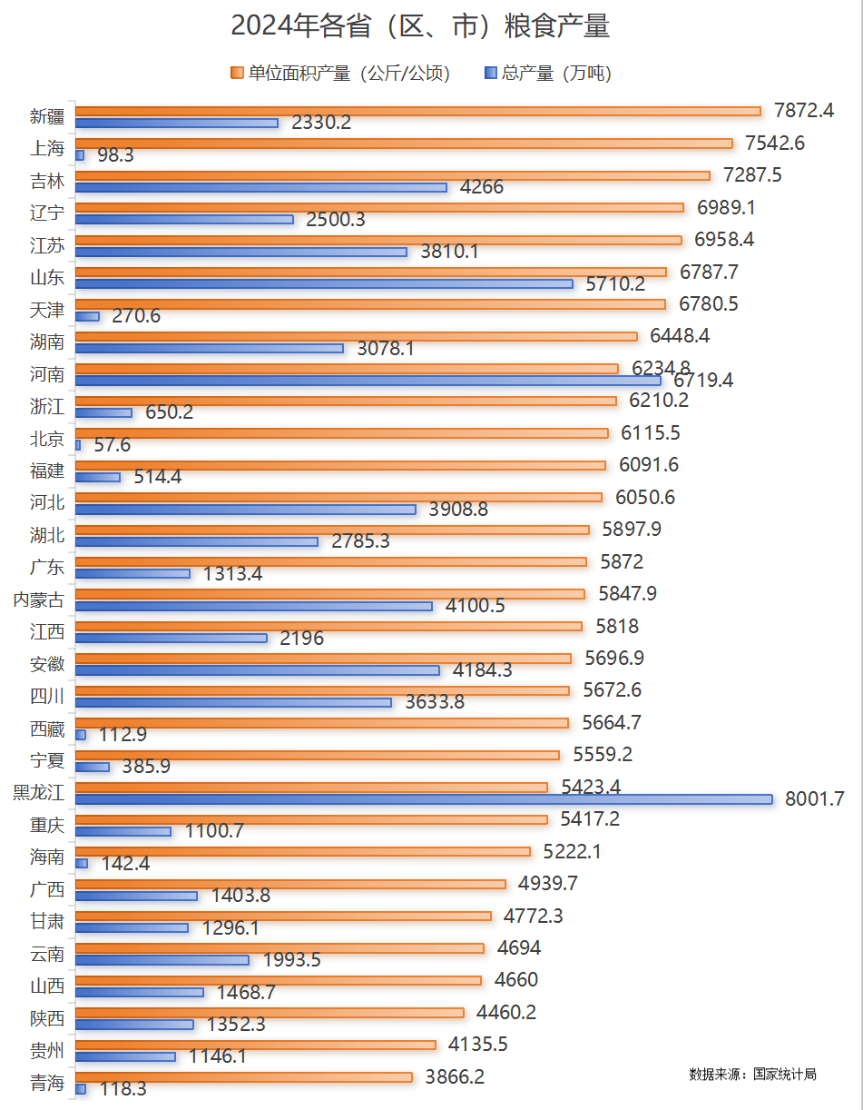 2024 年,一个人们想到它基本不会想到粮食的地方,超越了上海,成为新的单产之王—— 每亩产粮 524.8 公斤,较全国平均数高出 33%。
