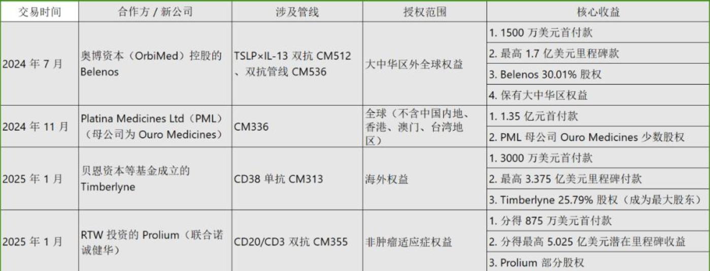 首先是 2024 年 7 月,康诺亚打响 NewCo 布局的第一枪,将 TSLP×IL-13 双抗 CM512 与另一款双抗管线 CM536 的大中华区外全球权益,授权给由全球顶级医疗专业基金奥博资本 (OrbiMed) 控股的新公司 Belenos。康诺亚获 1500 万美元首付款、1.7 亿美元里程碑款和 Belenos 的 30.01% 股权,并保有大中华区权益。