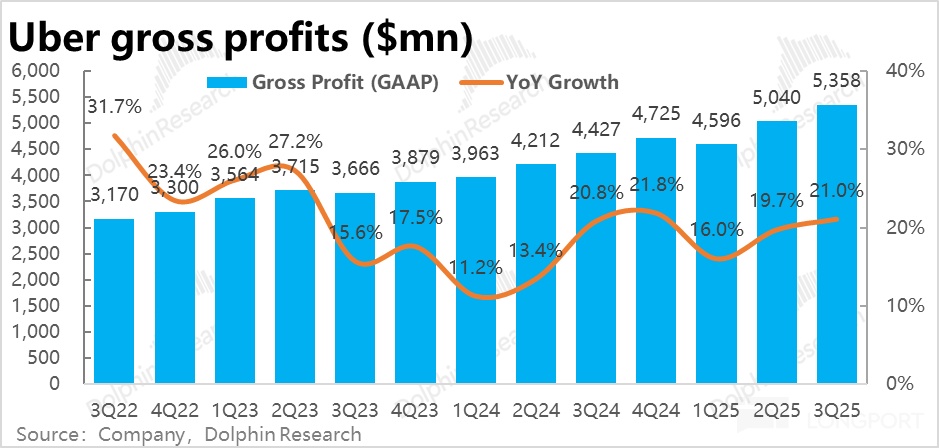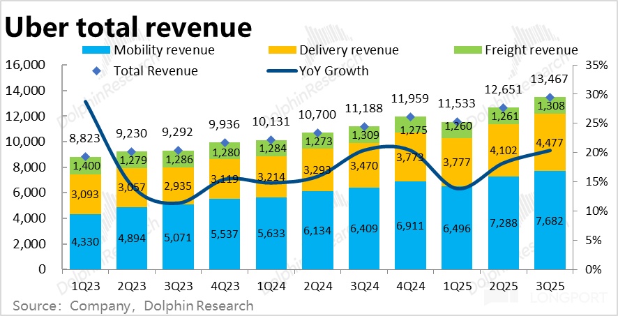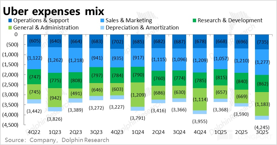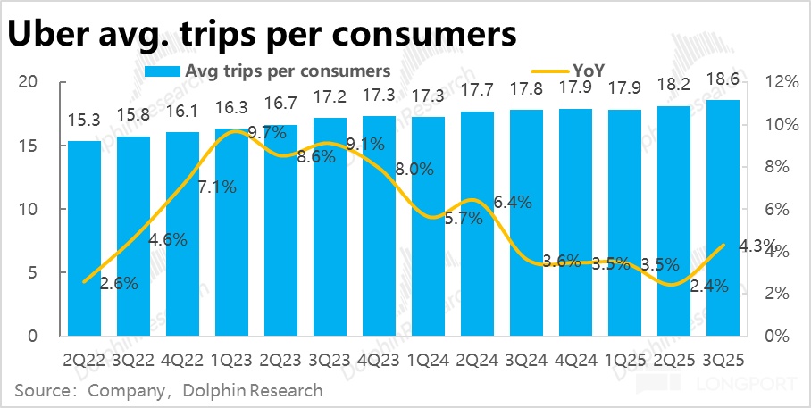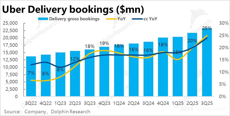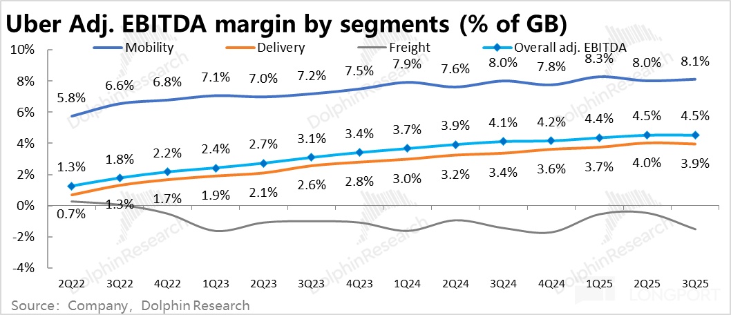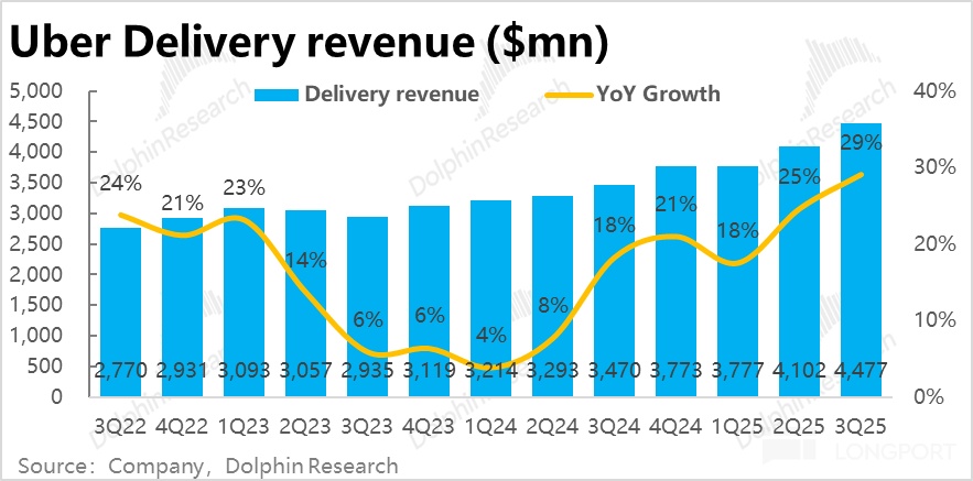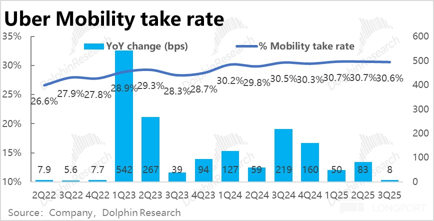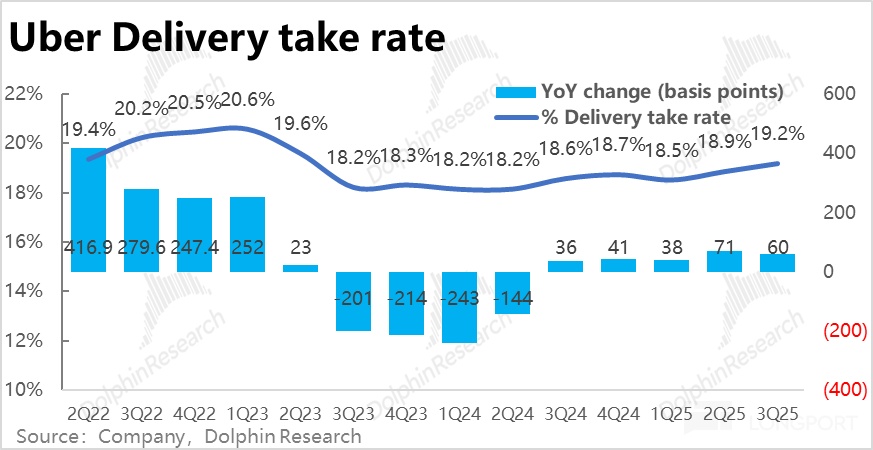 而外卖业务的变现率则继续走高,在不低基数下仍同比提升约 60bps。带动配送业务的收入增速环比明显提速了 4pct 到 29%,强于订单额增速。应当主要是 Uber 在广告上变现的贡献。