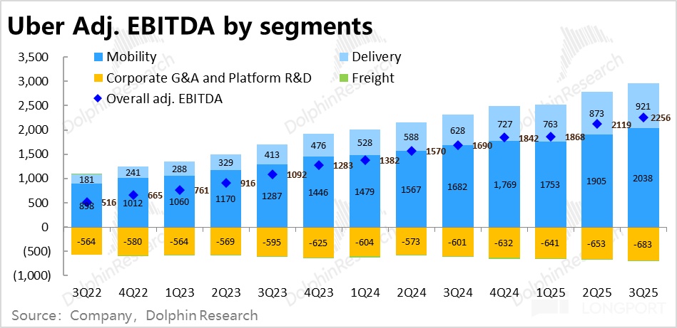 2) 另外则是在广告变现上 (尤其是配送业务),Uber 目前尚没有重复渗透,尤其是生鲜日杂的增长会进一步扩大公司的广告变现空间。