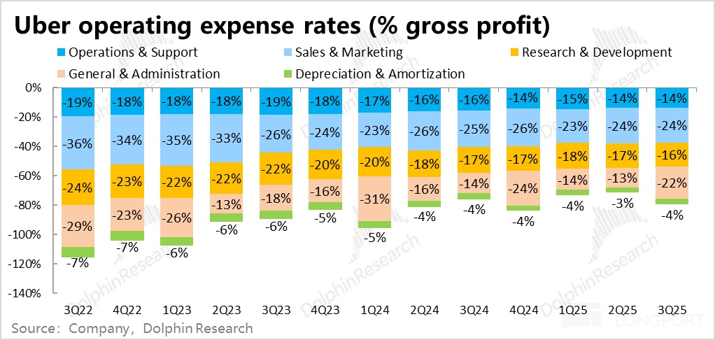 在毛利率基本停止提升,同时费用支出增速大幅抬头的情况下,本季 Uber 的利润表现不算超预期的出色。调整后 EBITDA 本季约 22.6 亿,虽同比增长 33.5%,但仍小幅跑输预期。利润率 (占订单额比重) 为 4.54%,同比提升仅 41bps,利润率提升幅度是 22 年以来的最低值。