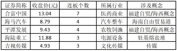 从连板情况来看,今日首板个股有 48 只;2 连板的个股有 11 只;3 连板及以上的个股有 8 只。今日连板数排名前 5 的个股包括合富中国、海马汽车、平潭发展、海陆重工、吉视传媒,具体如下表所示。