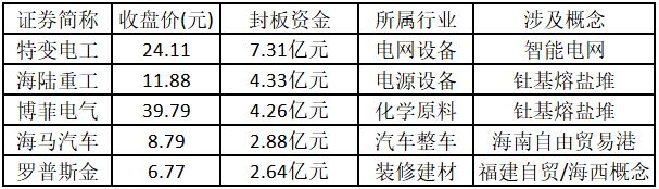 从封板资金来看,今日涨停板个股中,封板资金排名前 5 的个股包括特变电工、海陆重工、博菲电气、海马汽车、罗普斯金。