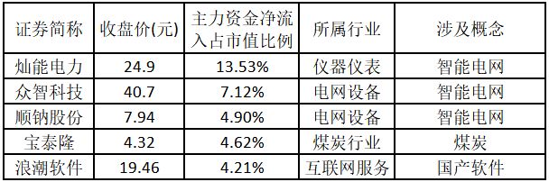 主力资金净流入金额占市值比例排名前 5 的个股分别为灿能电力、众智科技、顺钠股份、宝泰隆、浪潮软件。