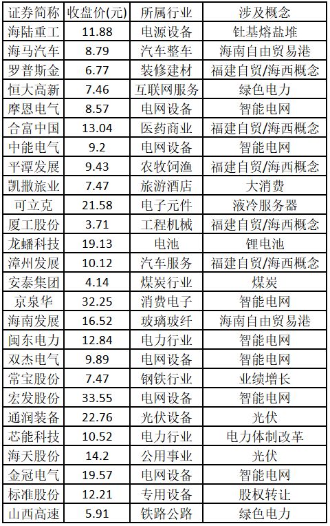 涨停板个股中,股价创出近一年新高的个股有 26 只 (不包括创出历史新高的个股),包括海陆重工、海马汽车、罗普斯金、恒大高新、摩恩电气、合富中国、中能电气、平潭发展、凯撒旅业、可立克、厦工股份、龙蟠科技、漳州发展、安泰集团、京泉华、海南发展、闽东电力、双杰电气、常宝股份、宏发股份、通润装备、芯能科技、海天股份、金冠电气、标准股份、山西高速,具体如下表所示。