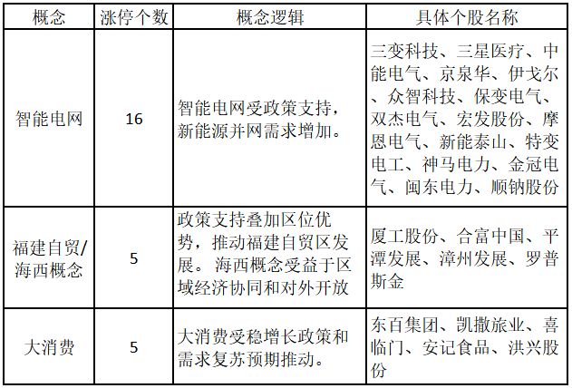从概念特征来看,今日涨停板个股中,智能电网、福建自贸/海西概念、大消费概念的个股最多。