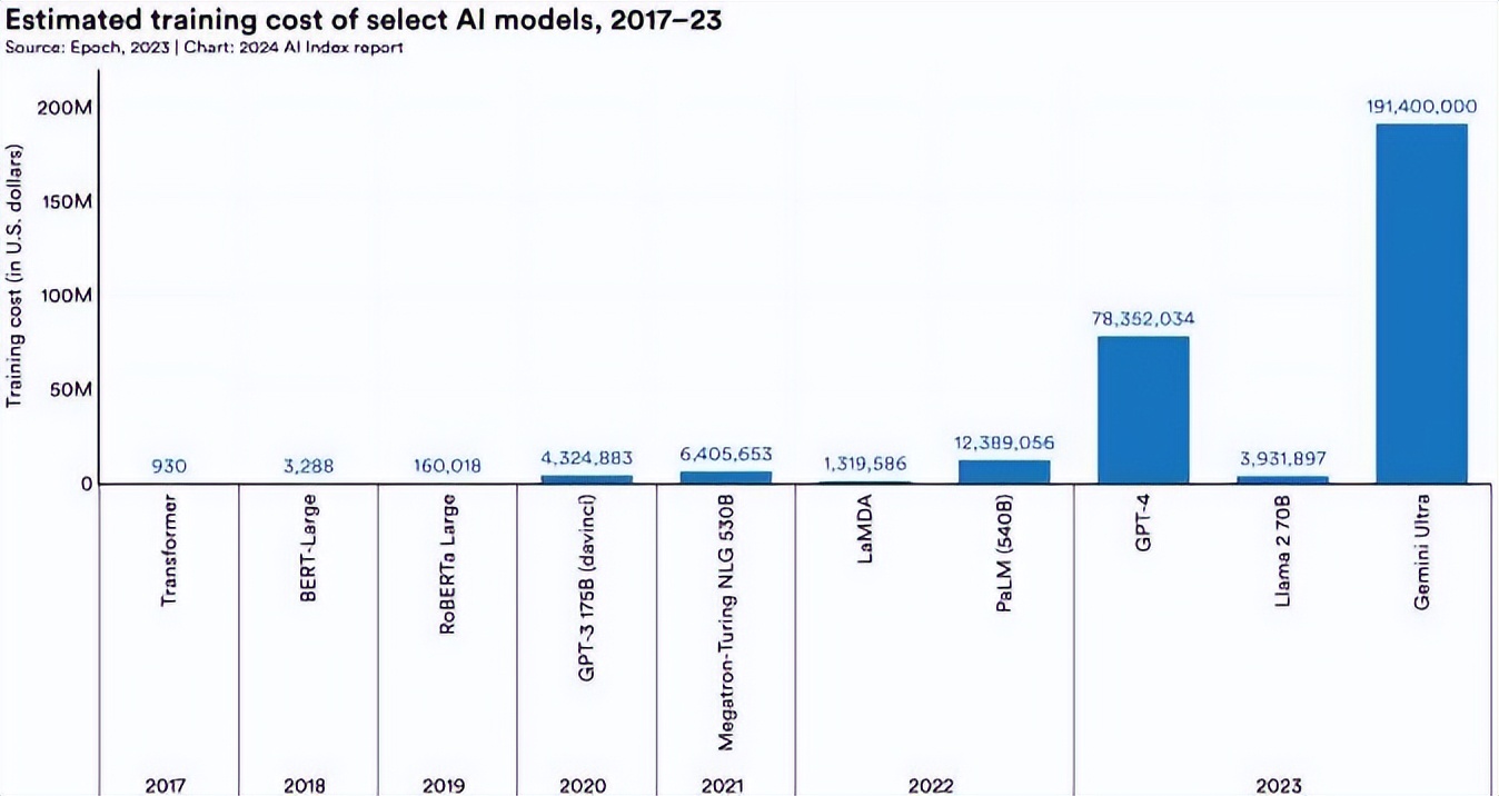 大模型训练成本的飙升速度令人瞠目。据 《2024 年人工智能指数报告》 显示,2017 年,Transformer 模型训练成本约为 900 美元;到 2023 年,OpenAI 的 GPT-4 和 Google 的 Gemini Ultra 的训练成本已分别达到了约 7800 万美元和近 2 亿美元。训练成本呈现飞速增长,这样的投入已非创业公司所能承担。