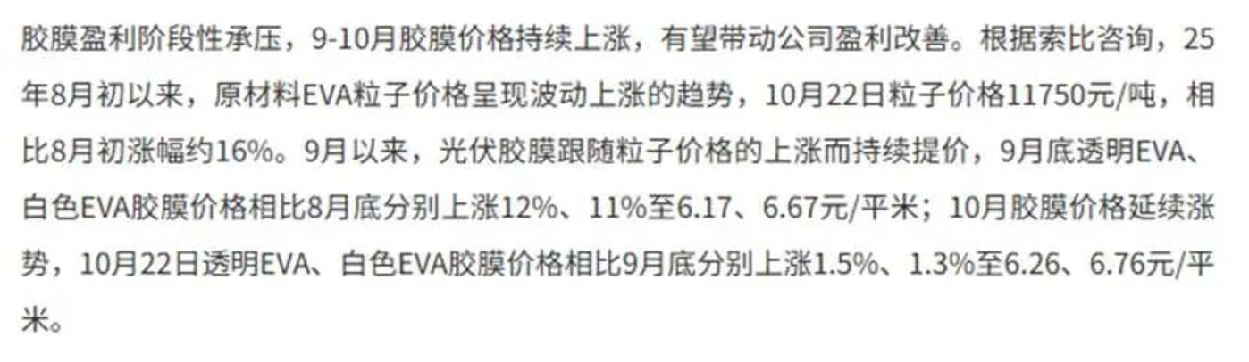 辅材中胶膜产业链三季度为其 「至暗时刻」,随着三季度阴霾散去,产业链价格出现明显回升,确认了 2025 年三季度为其至暗时刻的看法。