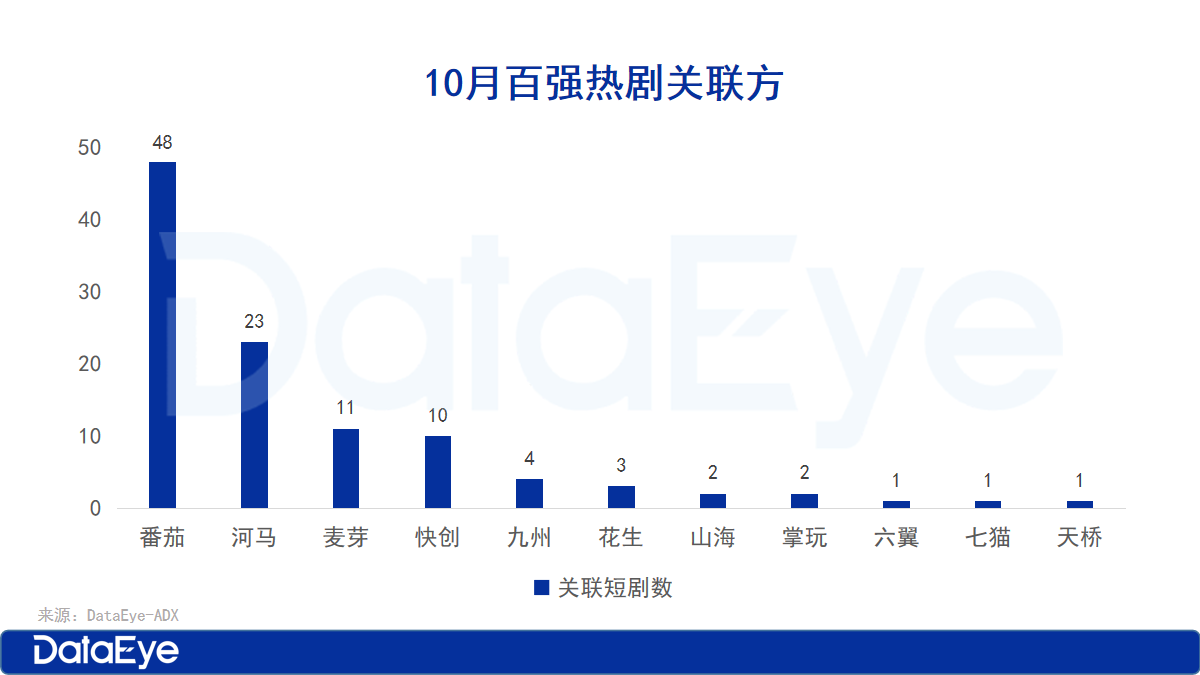 而从百强热剧的关联方来看,番茄本期依然遥遥领先,占 48 席,接近半数份额,较上期提升 10 席;河马第二,占 23 席;麦芽位列第三,占 11 席。本期 TOP3 平台关联微短剧数均超 10 席。快创、九州、花生、山海等平台则均占 10 席及以下。