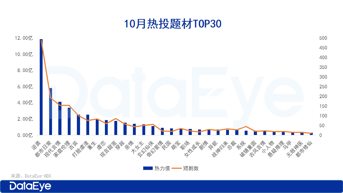 题材方面,10 月热投题材中,共有 13 种题材关联热力值破亿,5 种题材关联微短剧数破百。其中,“ 逆袭” 题材作为热门题材,10 月共关联 487 部微短剧,11.85 亿热力值。其中关联微短剧数较上期下降了 15%,关联热力值较上期下降了 7%,但仍大幅领先。