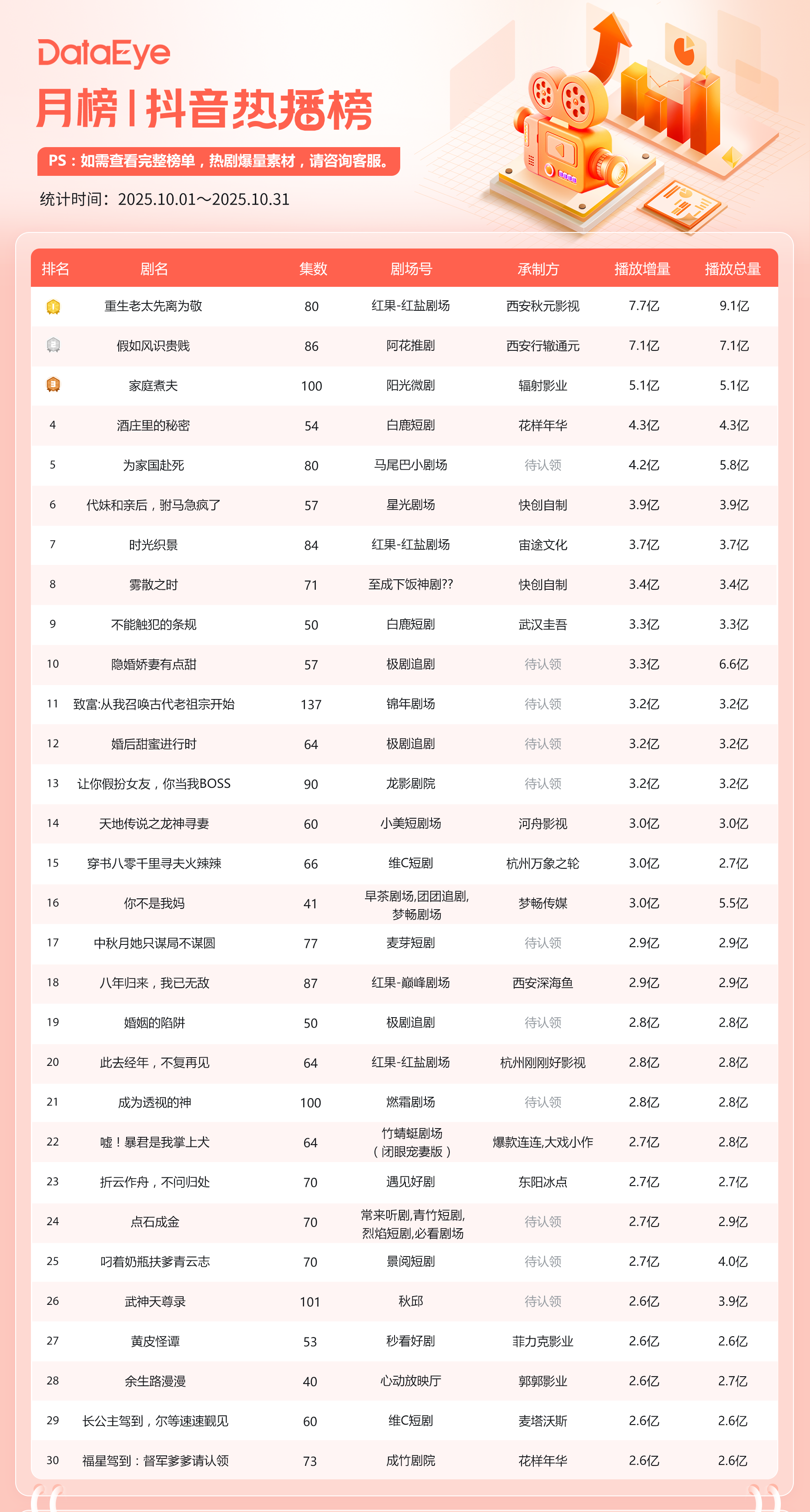 登顶百强热剧的 《家庭煮夫》 则在本期 DataEye 抖音热播榜月榜中位列第三,播放增量达 5.1 亿。