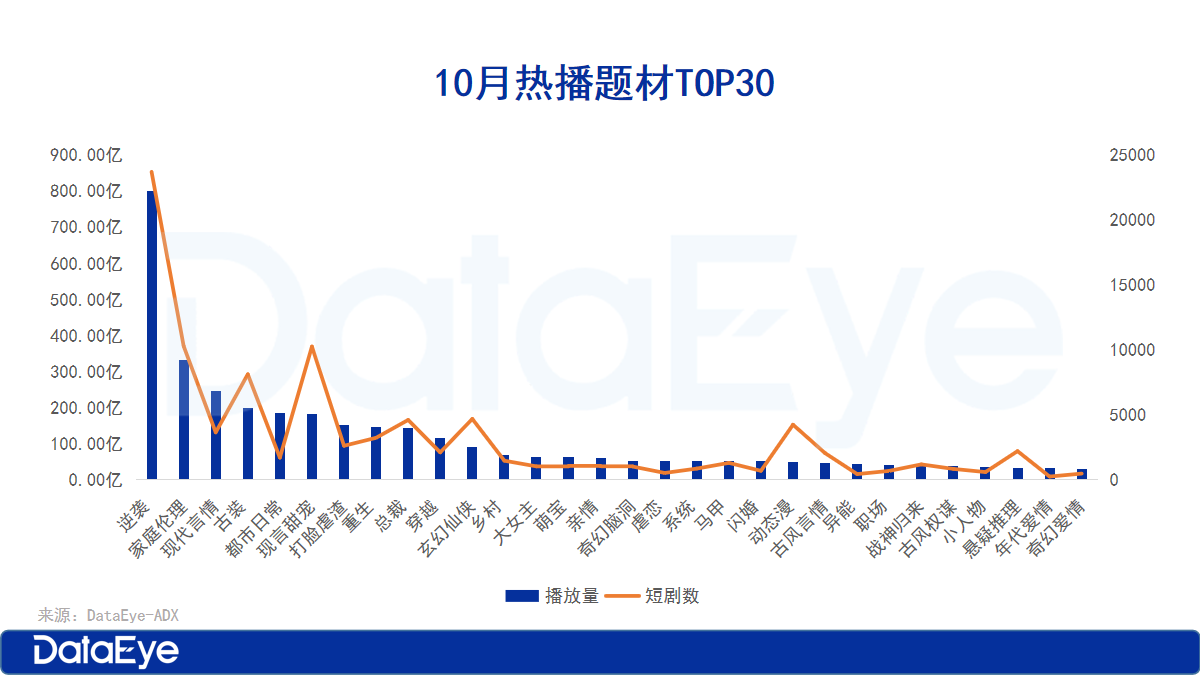 本期 TOP10 题材关联微短剧播放量均破百亿,其中逆袭、家庭伦理和现言甜宠三类题材关联微短剧数破万。