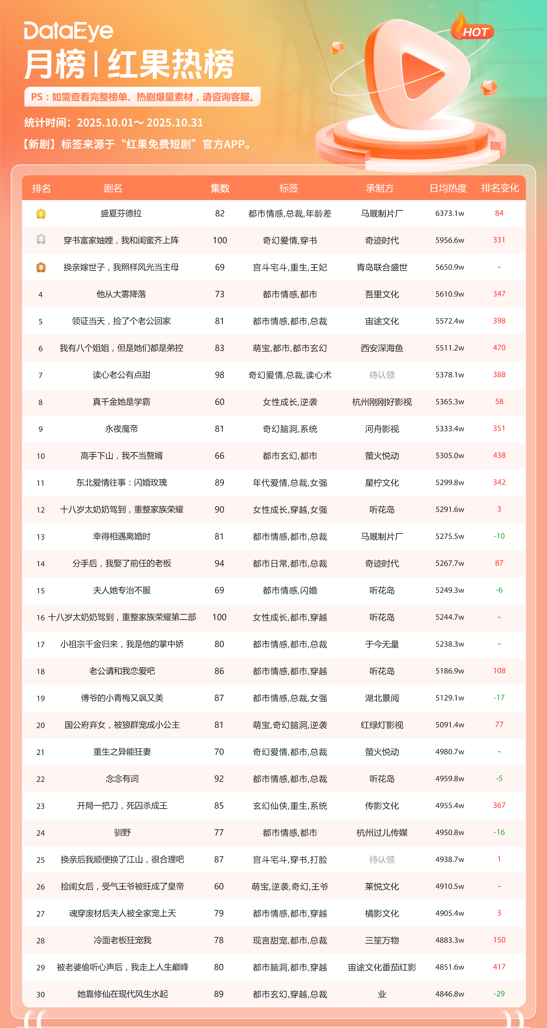 从题材来看,红果短剧中,都市题材热度较高,在 10 月 DataEye 红果热榜月榜 TOP30 中占了 19 席。打脸虐渣题材作为微短剧最具爽感的题材,也在 TOP30 中包揽了 18 席。