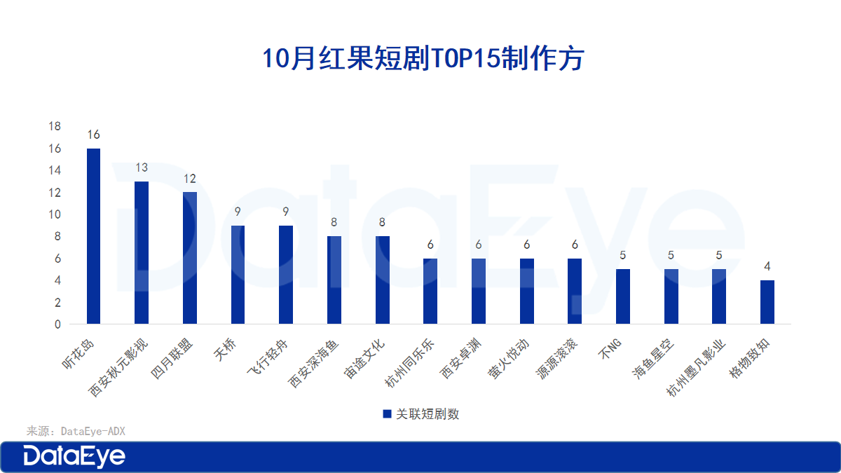 从制作方角度来看,10 月,DataEye 红果热榜月榜中,听花岛关联微短剧数达 16 部,占比第一;西安秋元影视关联微短剧达 13 部,位列第二;四月联盟关联微短剧达 12 部,排名第三。TOP3 制作方关联数均超 10 部。