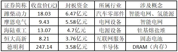 从封板资金来看,今日涨停板个股中,封板资金排名前 5 的个股包括潍柴动力、摩恩电气、海陆重工、恒大高新、德明利。欢迎大家关注微信公众号 「道达号」,其 「道达涨停复盘」 栏目为大家解读。