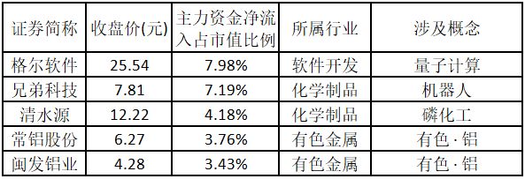 主力资金净流入金额占市值比例排名前 5 的个股分别为格尔软件、兄弟科技、清水源、常铝股份、闽发铝业。