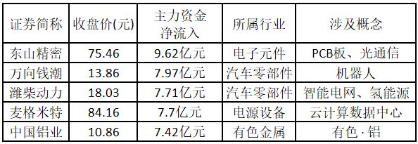 从主力资金来看,今日涨停板个股中,主力资金净流入金额排名前 5 的个股分别为东山精密、万向钱潮、潍柴动力、麦格米特、中国铝业。
