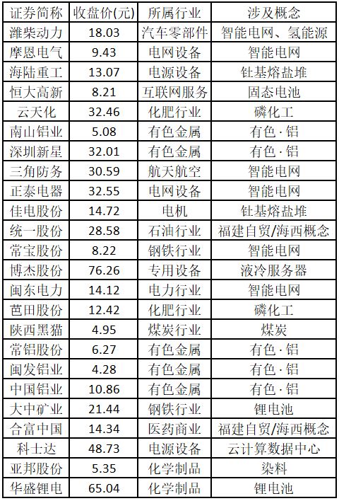 涨停板个股中,股价创出近一年新高的个股有 24 只 (不包括创出历史新高的个股),包括潍柴动力、摩恩电气、海陆重工、恒大高新、云天化、南山铝业、深圳新星、三角防务、正泰电器、佳电股份、统一股份、常宝股份、博杰股份、闽东电力、芭田股份、陕西黑猫、常铝股份、闽发铝业、中国铝业、大中矿业、合富中国、科士达、亚邦股份、华盛锂电,具体如下表所示。