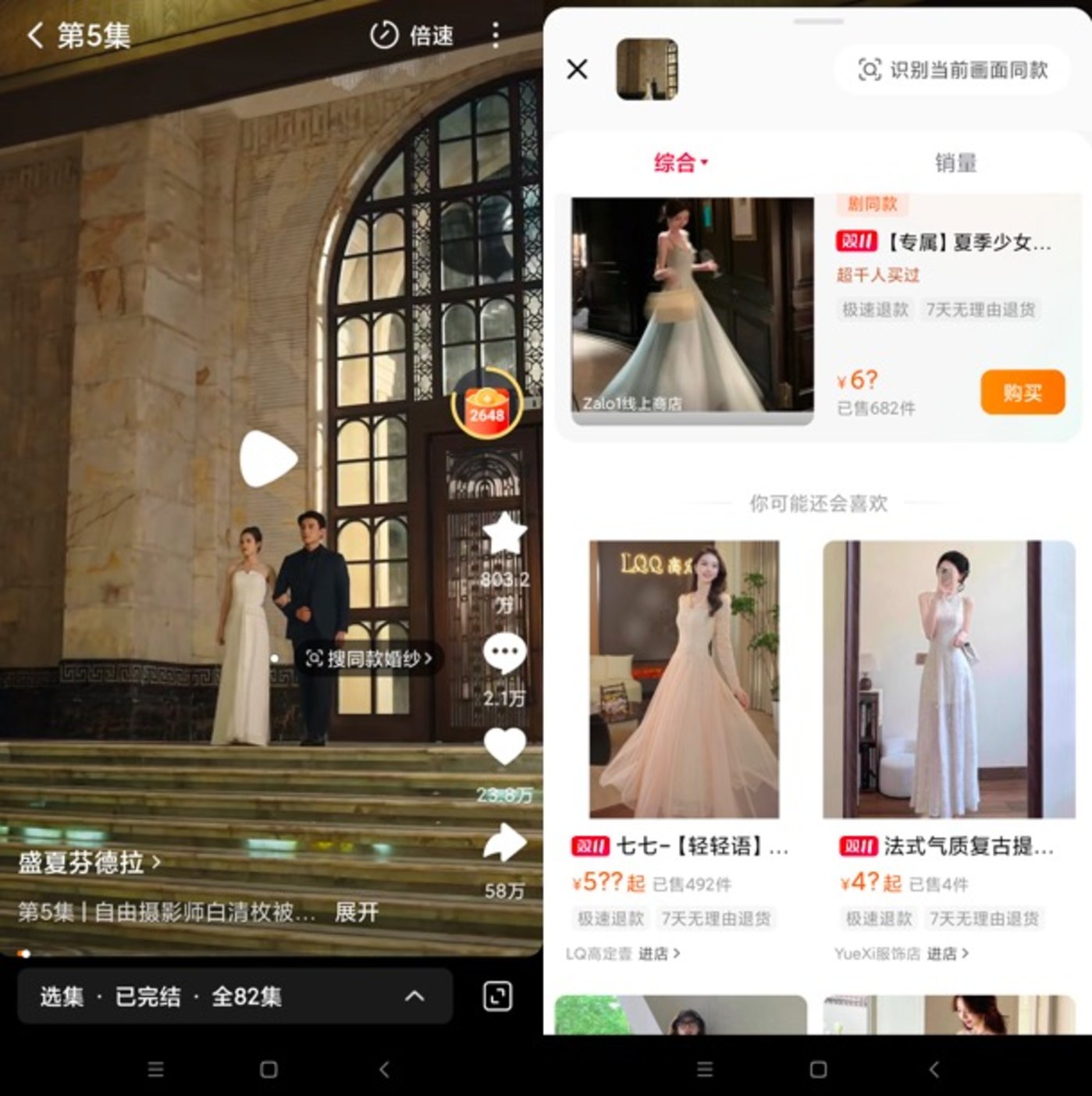 根据商业新研社的体验,该功能已覆盖红果短剧上 《盛夏芬德拉》、《好一个乖乖女》 等主流剧集。当用户暂停观看时,系统会自动识别剧中服装、饰品等商品并弹窗推荐,点击即可进入详情页;未自动弹出时,也可通过右上角 「识图搜同款」 定向识别,服饰、家居等高频品类识别准确率较高。