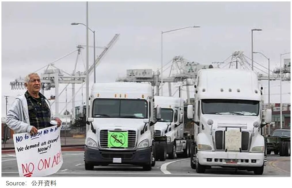 上百名美国卡车司机罢工,堵在码头门口,抗议 AB5 法案的实行,并最终推动一条允许 Uber 们“ 作弊” 的提案出台。