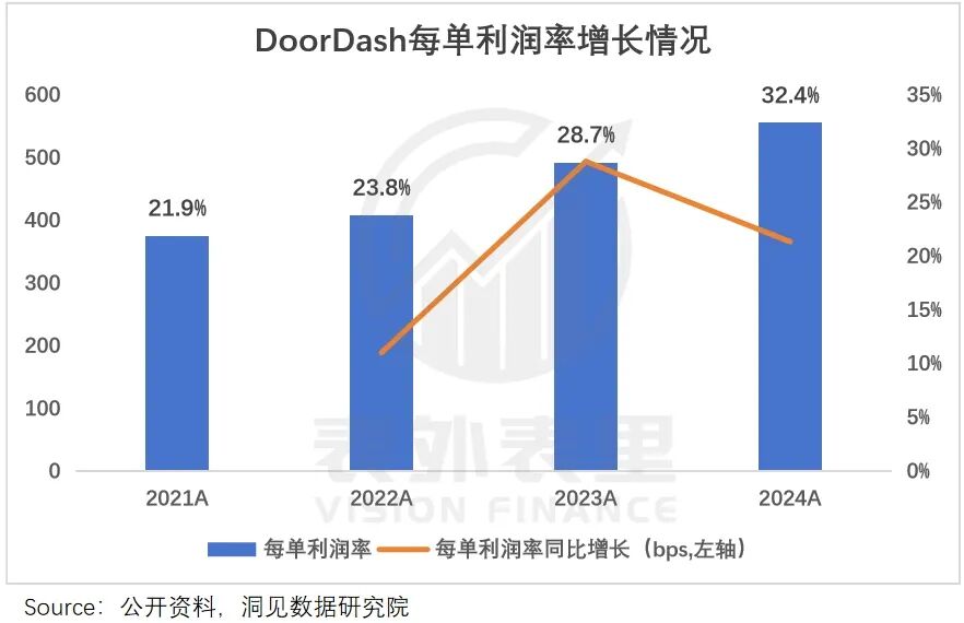 一步步谋划之下,DoorDash 把餐饮配送做成了一项高毛利、服务型的业务。2024 财年,其平均每 10 美元的订单,能挣 3.2 刀。