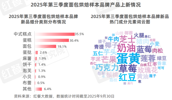 2025 年第三季度,在红餐产业研究院监测的面包烘焙品牌中,有 40 个面包烘焙品牌共推出了 1,025 款新品。从面包烘焙新品的细分种类来看,中式糕点类的新品数量最多,共推出了 364 款,占新品总数的 35.5%。