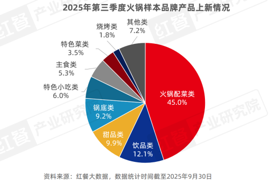 2025 年第三季度,红餐产业研究院监测的 28 个火锅品牌共推出了 282 款新品,从新品的细分类别来看,当月火锅新品涵盖的类别有火锅配菜类、饮品类、甜品类、锅底类等 9 种类别。