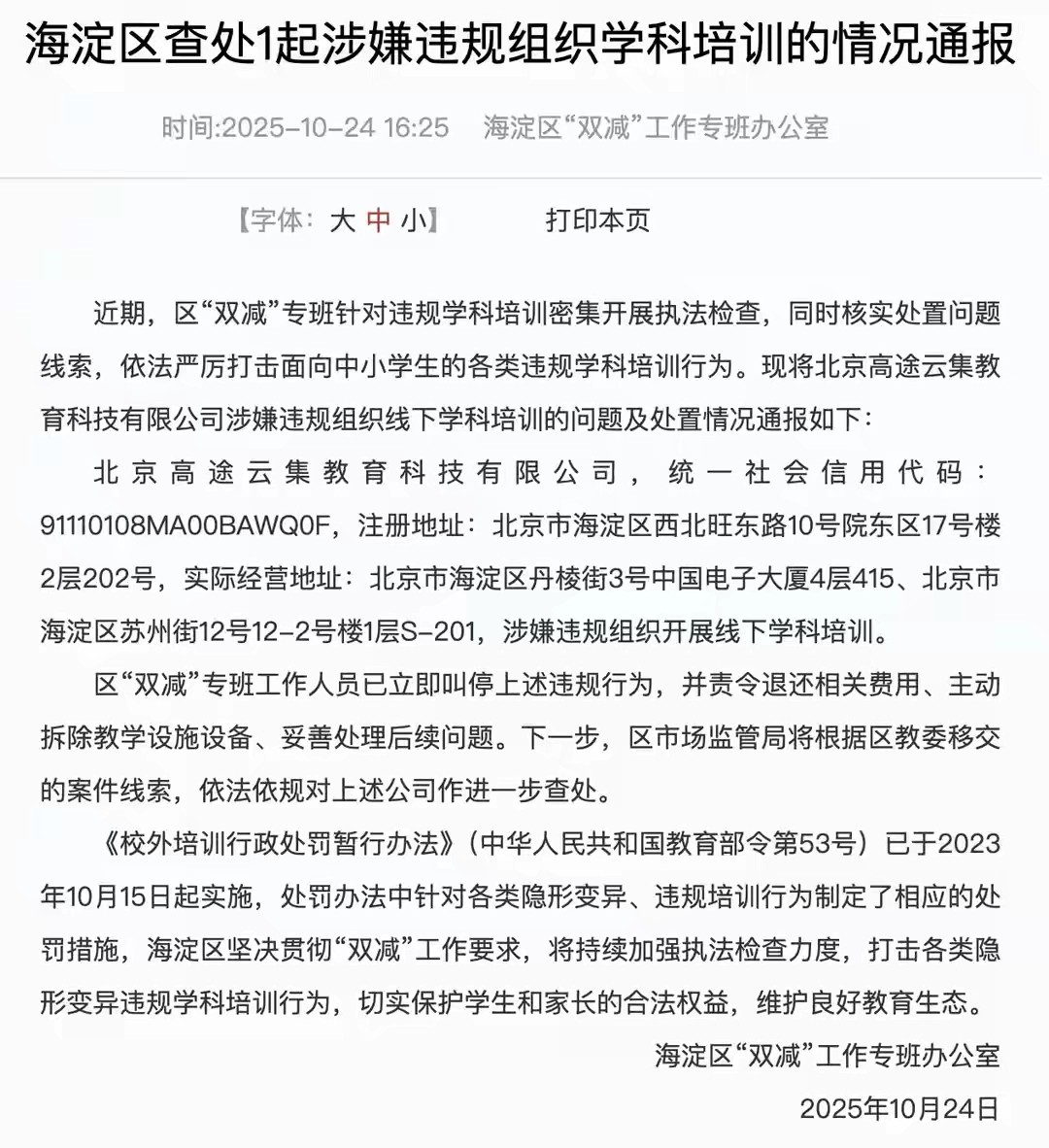 近日,海淀教育官网发布消息,海淀区“ 双减” 专班查处北京高途云集教育科技有限公司涉嫌违规组织线下学科培训,并通报了相关情况。