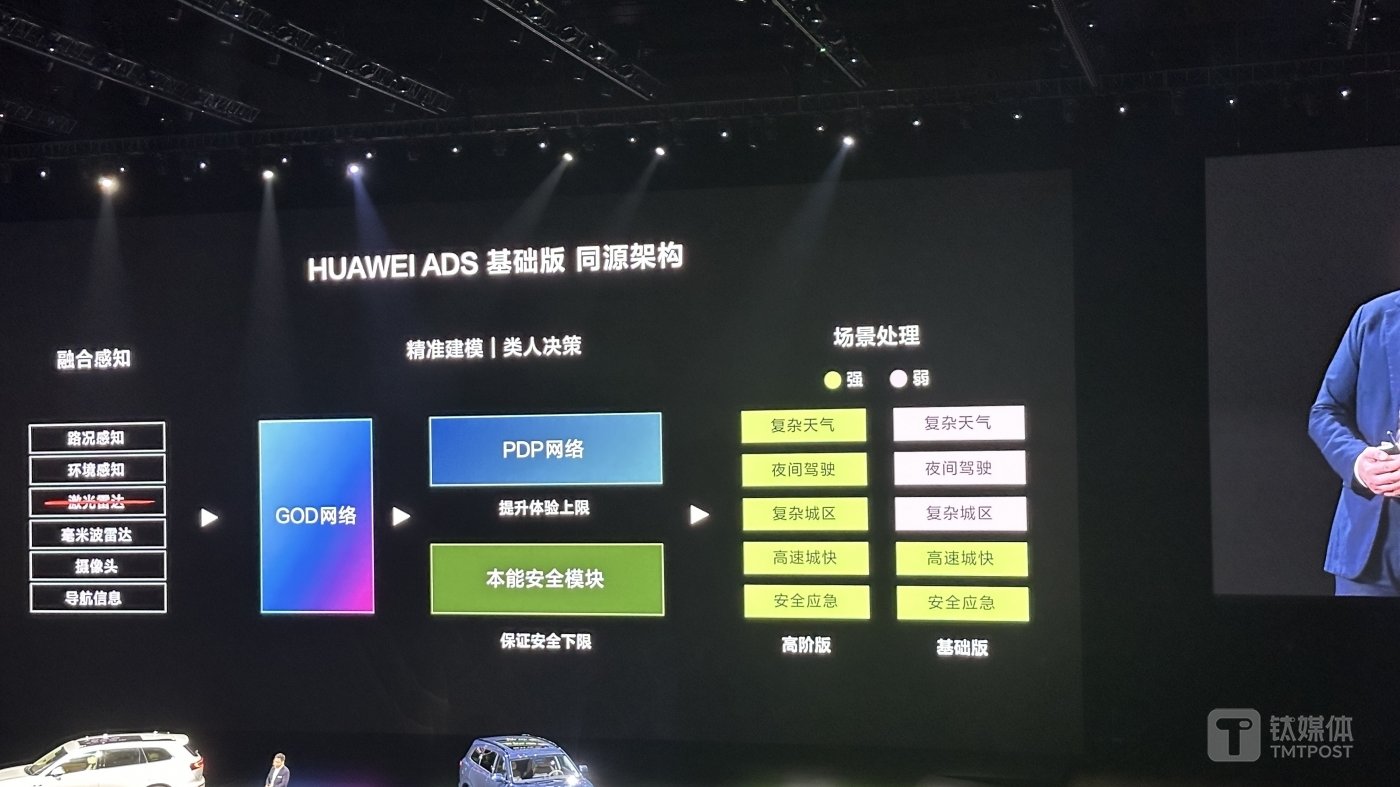 和高阶版相比,华为 ADS 基础版在底层技术上和高阶版是同源架构,也应用了 GOD 网络和 PDP 网络以及本能安全模块,都有提升体验上限和保证安全下限的作用。