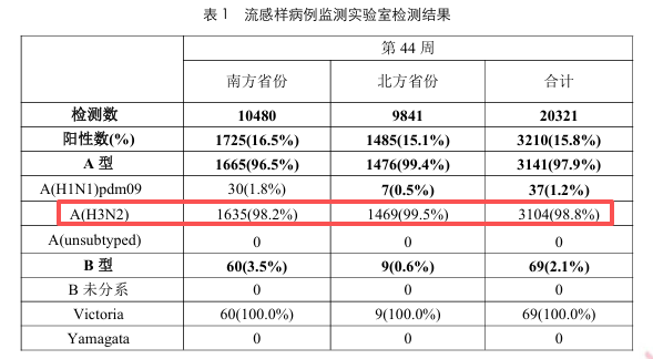 中国疾控中心 (以下简称“ 中疾控”) 昨日发布的第 44 周流感监测周报给出明确信号:南方省份检测到 1725 份流感病毒阳性标本,其中 1635 份为甲型 H3N2;北方省份检测到 1485 份流感病毒阳性标本,其中 1469 份为甲型 H3N2。流感季已正式拉开序幕,流行毒株与去年不同,南北方甲型 H3N2 毒株占比均超 95%。