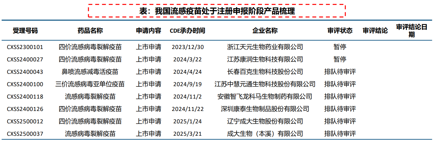 此外,三价鼻喷减毒活疫苗国内已有百克生物的获批,适用于 3-17 岁人群,以“ 无需打针” 的便捷性抢占差异化市场;佐剂疫苗赛道同样动作频频,海外 Seqirus 公司产品已获批使用,国内虽暂无相关产品上市,华兰疫苗、百克生物等多家公司已在进展当中,产品上市后有望填补高端市场空白。