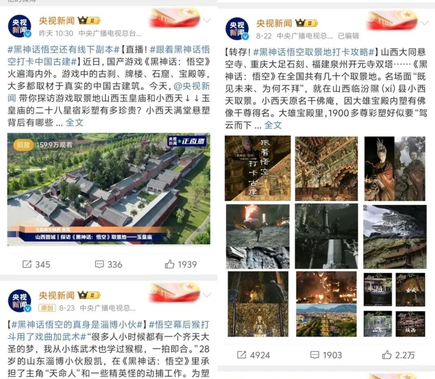 在各大社交和短视频平台,诸多和游戏不沾边的蓝 V、官媒、政务号更是十分活跃。比如,「央视新闻」 从 8 月 20 日开始,到 8 月 24 日,连发 7 条有关 《黑悟空》 的微博,从 「外国网友打听一只猴子」 到 「每个人童年都有一个齐天大圣」,从 「国潮作品出圈海外」 到 「黑悟空取景地打卡」「黑悟空真身」「黑悟空线下副本」,尽管微博是政务、权威媒体重点活跃发声平台,但央视新闻如此高密度、多元化为一款游戏发声,也是首次。