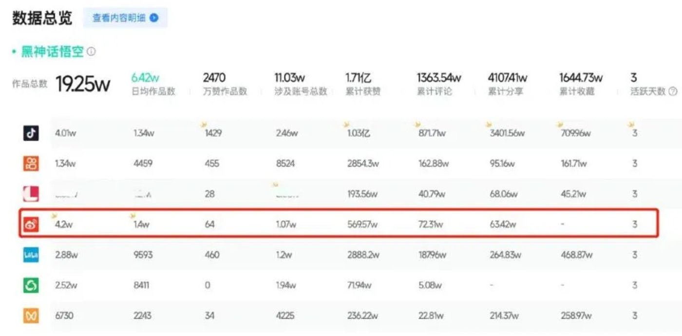 以 《黑悟空》 为例,根据新榜旗下 「声量通」 显示,8 月 20 日-22 日,抖音、快手、微博、B 站、公众号、视频号等主流内容平台累计作品数量达 19.25 万,累计获赞量超 1.71 亿。