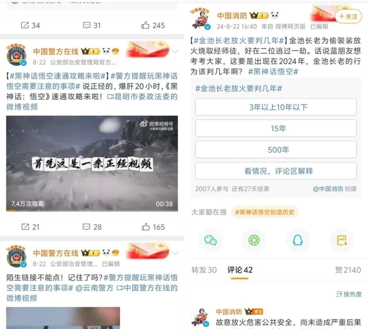 截至目前,已有 「文旅之声」「中国警方在线」 等 7 家部委,以及各地文旅、共青团、消防、气象、公安等多部门 700 多家政务官微,通过行业视角多元化解读 《黑悟空》。比如 「中国消防」 官博,别出心裁发起 「金池长老放火要判几年」 话题投票;「中国警方在线」 截至目前也发了 5 条 《黑悟空》 微博,从提醒玩 《黑悟空》 注意事项到教天命人快速通关,多元化视角去 「广告科普」。