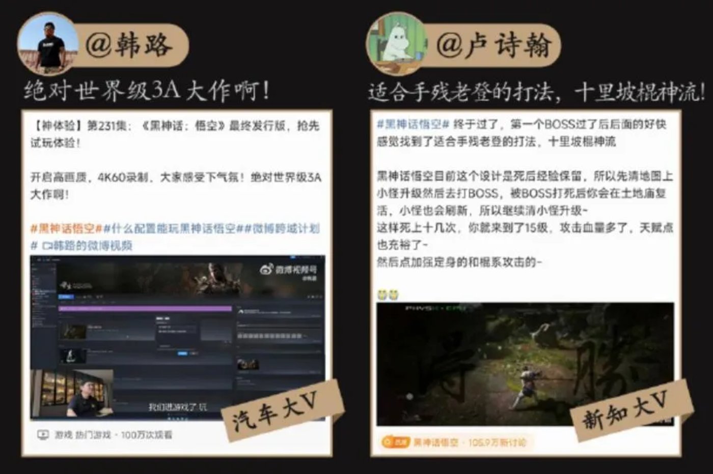 汽车领域金橙 V 韩路、小米高管王腾、新知大 V 卢诗翰、陈赫等都发布了有梗有料的博文,在各自领域形成初步用户口碑——游戏还未发售,便有大量用户准时守候在屏幕前。游戏大爆后,这些用户又成为 「自来水」,进一步推动游戏热度。