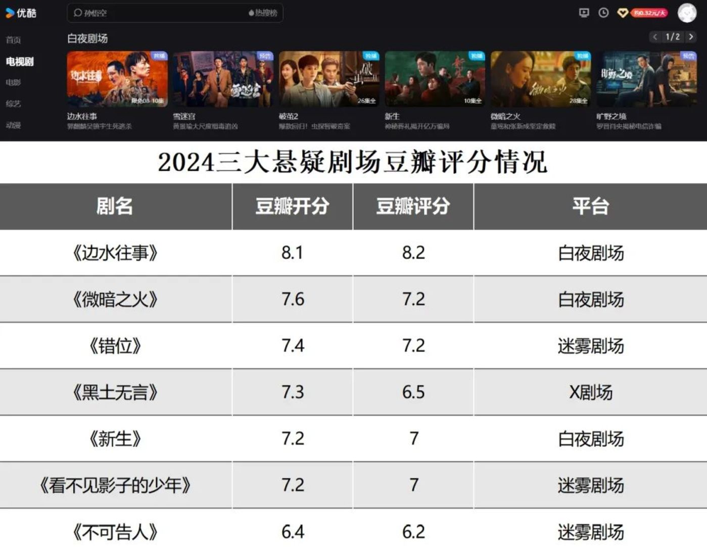 而另一边,2024 年,优酷的 「白夜剧场」 连出三个爆款。《微暗之火》 开分就获得了豆瓣评分 7.6 分的高分。《边水往事》 播出后票房口碑双丰收,最新的豆瓣评分已经涨到 8.2 分,是豆瓣历史上开分最高的国产网剧。《新生》 集均播放量一度获得 2024 纯网播剧、精短类剧集和悬疑剧集第一的成绩。