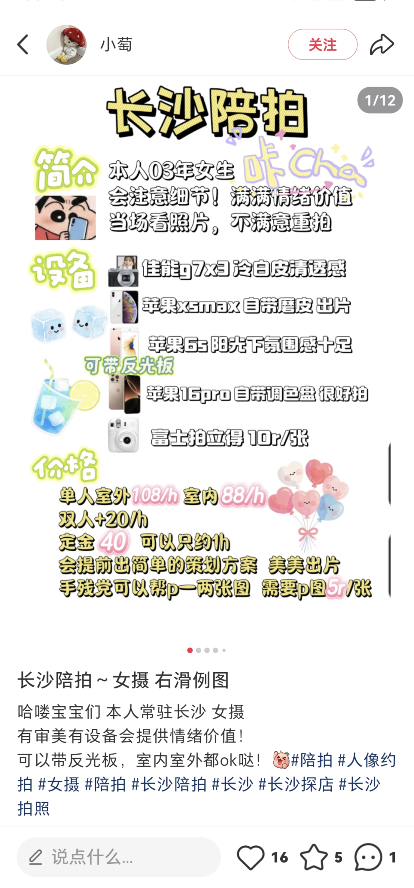 这 8000 元也为小萄提供了一种可量化的陪拍价值。她在小红书上宣传自己时,会标明自己的设备有佳能 G7X3、iPhone XS Max、iPhone 6S、富士拍立得等,并在每一款设备旁边都标注诸如 「冷白皮清透感」、「自带磨皮」 等推荐理由。