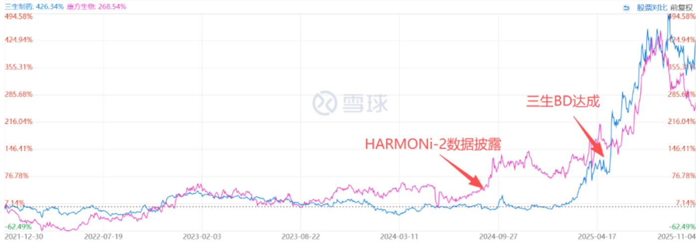 图:康方生物与三生制药股价对比,来源:雪球