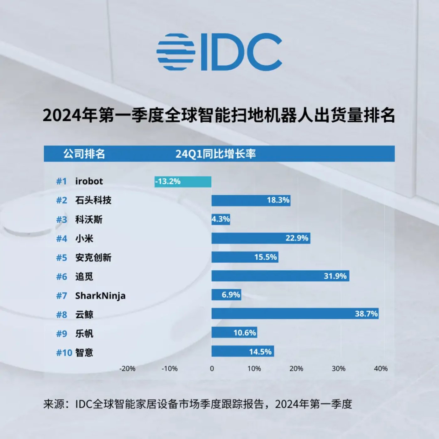 与此同时,石头科技、科沃斯、小米、安克创新、追觅、云鲸、乐帆、智意,共计 8 家中国扫地机器人厂商的出货量冲进前十,一些厂商的同比增长率甚至接近 40%。
