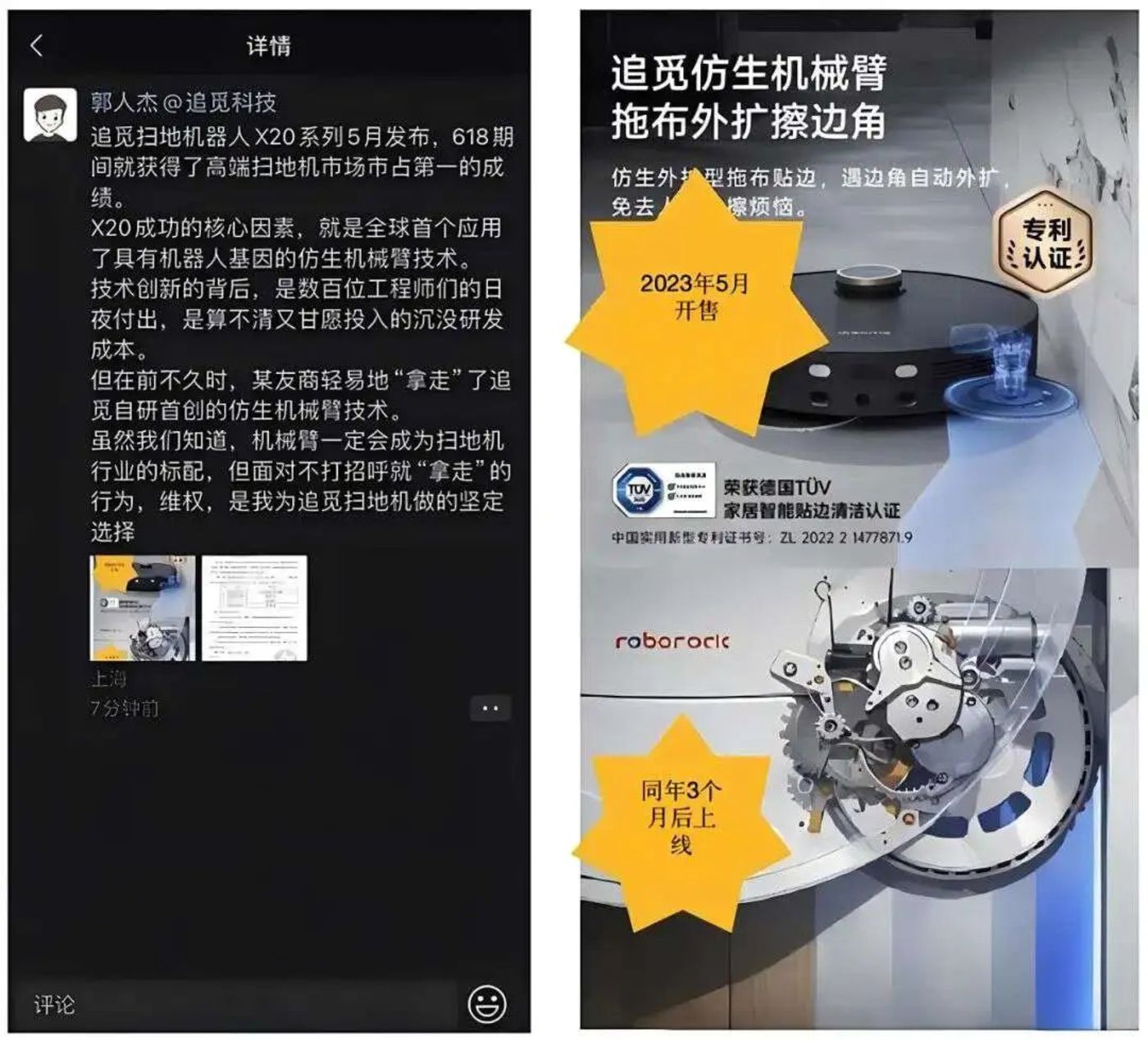 2023 年 10 月,追觅科技中国区副总经理郭人杰发布朋友圈,称某友商 「不打招呼拿走」 追觅自研首创的仿生机械臂技术,并在配图中晒出了专利侵权警告函,称要为追觅扫地机维权。