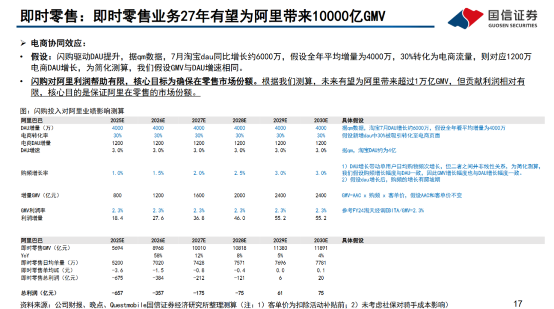 根据国信证券 8 月份的一份报告测算数据显示,到 2027 年即时零售业务有望为阿里带来万亿 GMV,但几乎难以贡献利润,扣掉电商协同效应下赚的 36.8 亿,整体可能还要亏掉 175 亿。