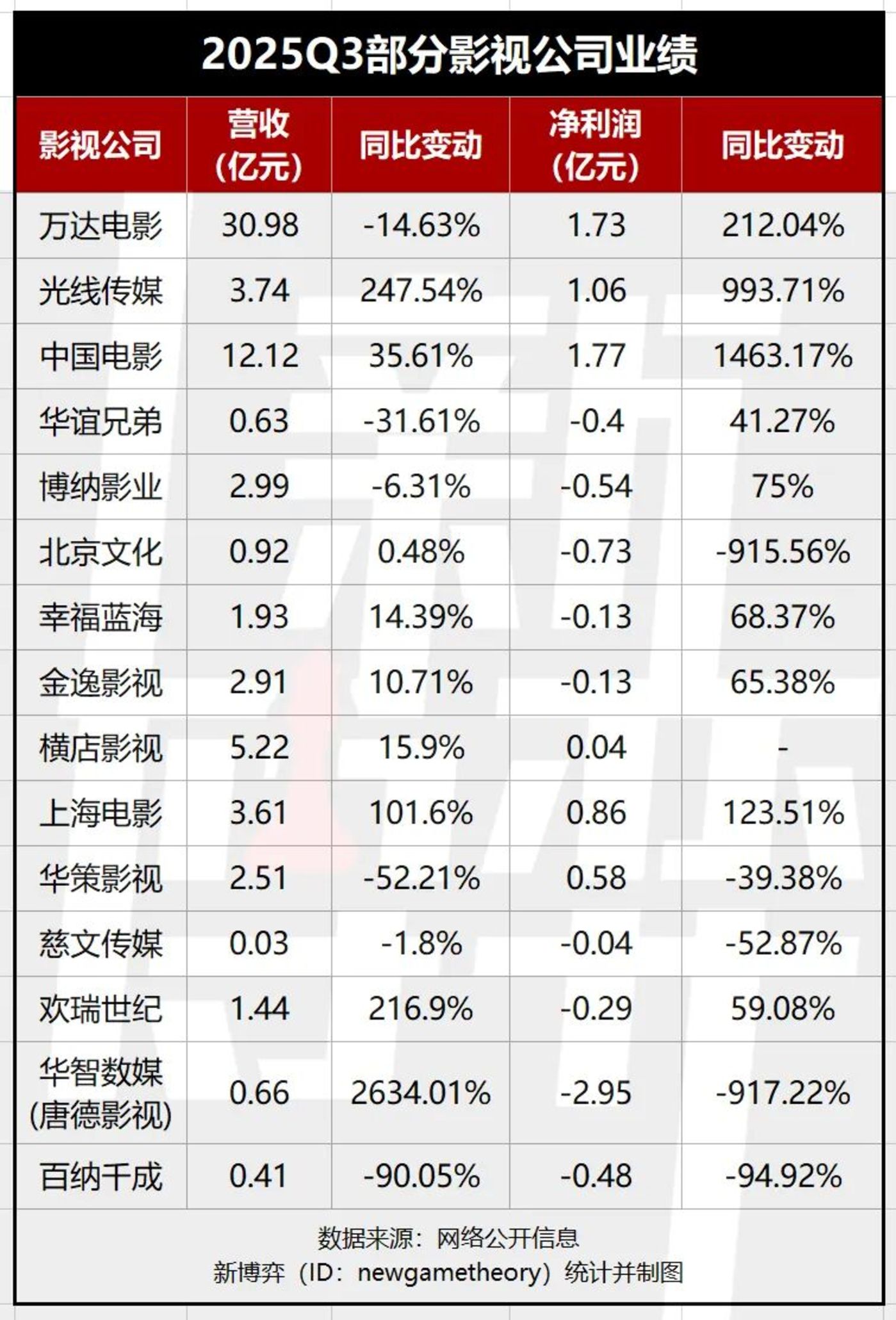 据新博弈不完全统计,万达电影三季度营收超 30 亿领跑,中国电影三季度的净利润同比暴涨 1463.17%,光线传媒报告期内的净利润涨幅也达到 993.71%。但有人欢喜有人忧,华谊兄弟、北京文化等公司还在继续亏损,其中,北京文化、华智数媒 (原唐德影视) 在报告期内的净利润降幅均在 900% 以上。