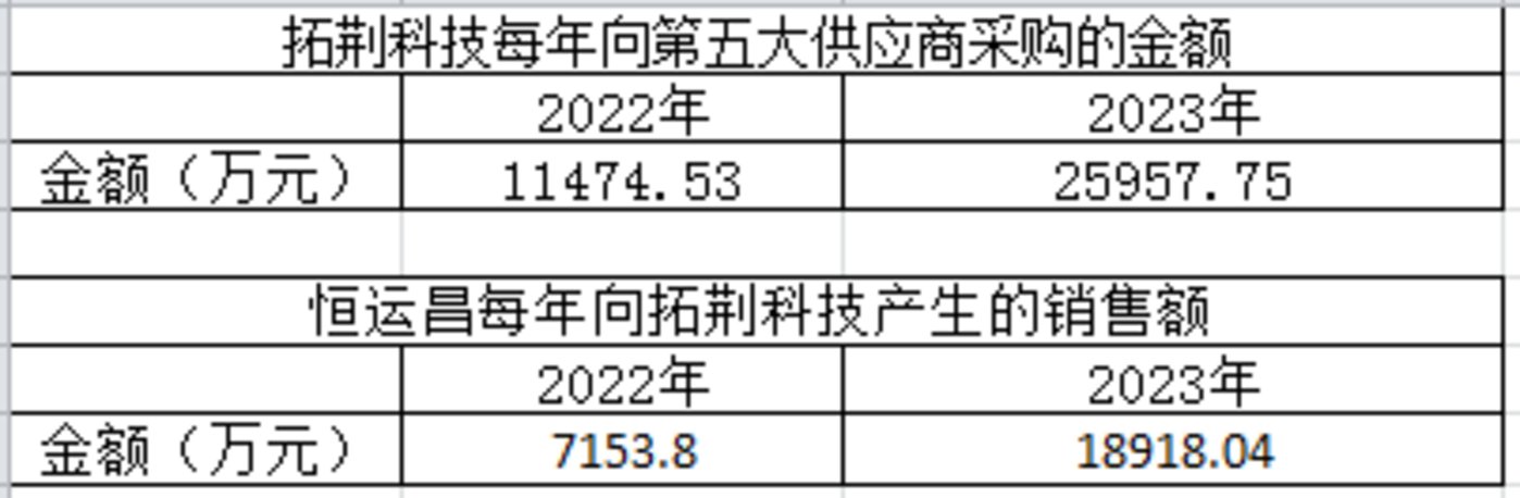 拓荆科技 2024 年披露的前五大供应商中,第二大供应商为新进入名单,结合双方合作规模判断,该供应商极有可能是恒运昌 (2022 年、2023 年恒运昌交易金额未达拓荆科技前五大供应商标准),而拓荆科技 2024 年向其第二大供应商的采购金额为 36741.28 万元,但恒运昌同期披露的向拓荆科技销售收入为 34142.26 万元,两者之间相差 2599.02 万元,对于这一显著的数据偏差,目前尚未有明确合理的解释。