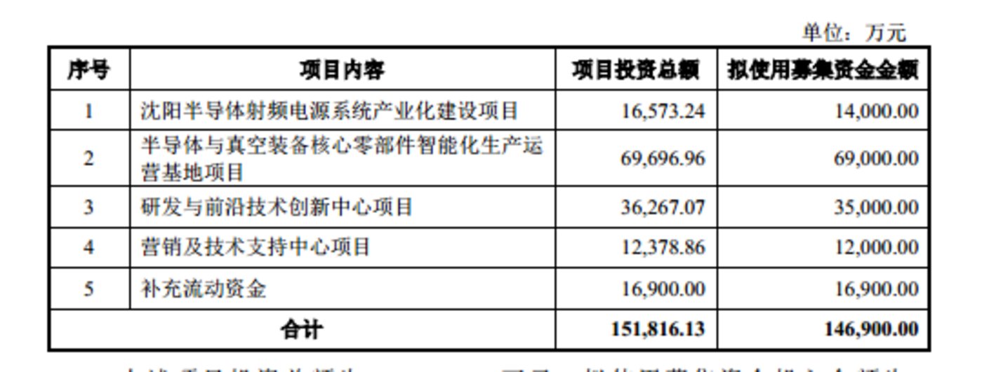 从募投项目上看,恒运昌此次 IPO 欲募集 14.69 亿元,分别用于沈阳半导体射频电源系统产业化建设项目、半导体与真空装备核心零部件智能化生产运营基地项目、研发与前沿技术创新中心项目、营销及技术支持中心项目、补充流动资金,具体情况如下:
